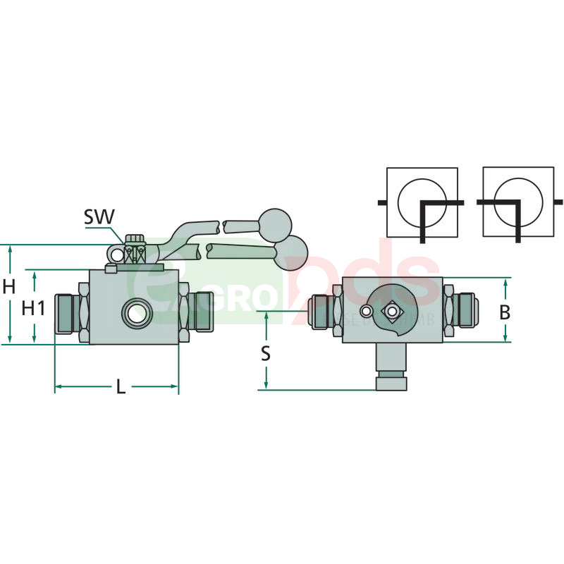 Robinet tip bloc cu 3-cai, cu supapa cu bila cu orificiu L.